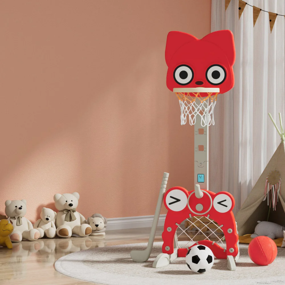 Introduce your little ones to the world of sports with the Everfit Kids Basketball Hoop Stand. Perfect for children aged 3-7, this 5-in-1 sports centre encourages active play with basketball, soccer, a ring toss, golf, and a removable music box. Made from non-toxic PP material, it features a smooth, safe surface and a stable triangular base that can be filled with water for added stability. Ideal for indoor or outdoor use, its height is adjustable to grow with your child. Easy to set up and maintain, it's the ultimate gift for endless fun and fitness.