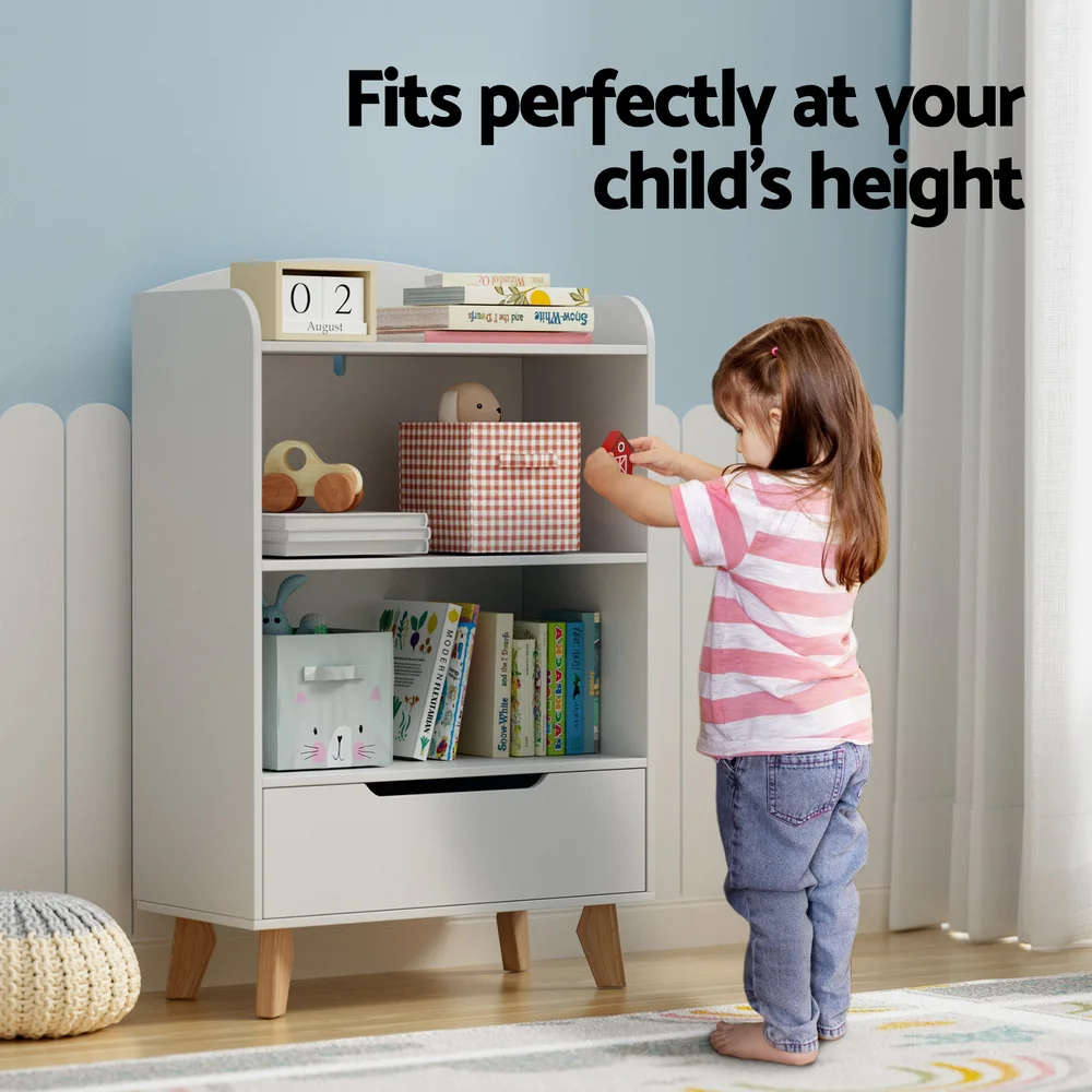 Keezi Kids 3-Tier Bookshelf with Drawer, 95cm White Storage Organiser, Smooth Finish, Easy Assembly, Non-Toxic Materials