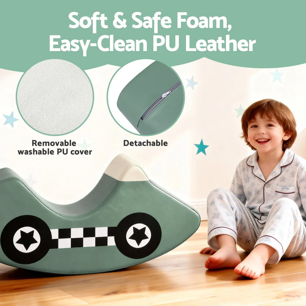 Transform your child's playtime with Keezi's Kids Climbing Blocks Foam Toddler Playset, a captivating green soft indoor climbing toy. Crafted for safety and fun, this playset is perfect for home playrooms, daycares, or early learning centres. It features a soft, high-density foam core and a smooth, wipe-able PU leather cover, creating a cushioned and hygienic environment for endless adventures. Watch as your little ones enhance their motor skills, balance, and stability while sparking their imagination and creativity. With a unique race car-inspired design, this playset is both educational and entertaining.