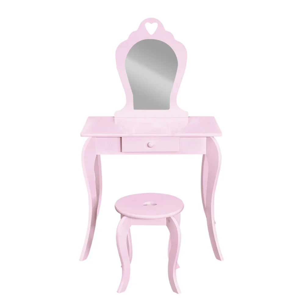 Transform your little one's room into a royal chamber with the Keezi Kids Dressing Table Stool Set. This charming vanity set, in a delightful pink hue, features a faux makeup mirror and a functional drawer for storing all her beloved accessories. Designed with a heart-shaped motif and crafted from quality MDF board, it ensures safety with rounded corners and robust construction. Easy to clean and perfect for imaginative play, this set is a dream come true for every budding princess.