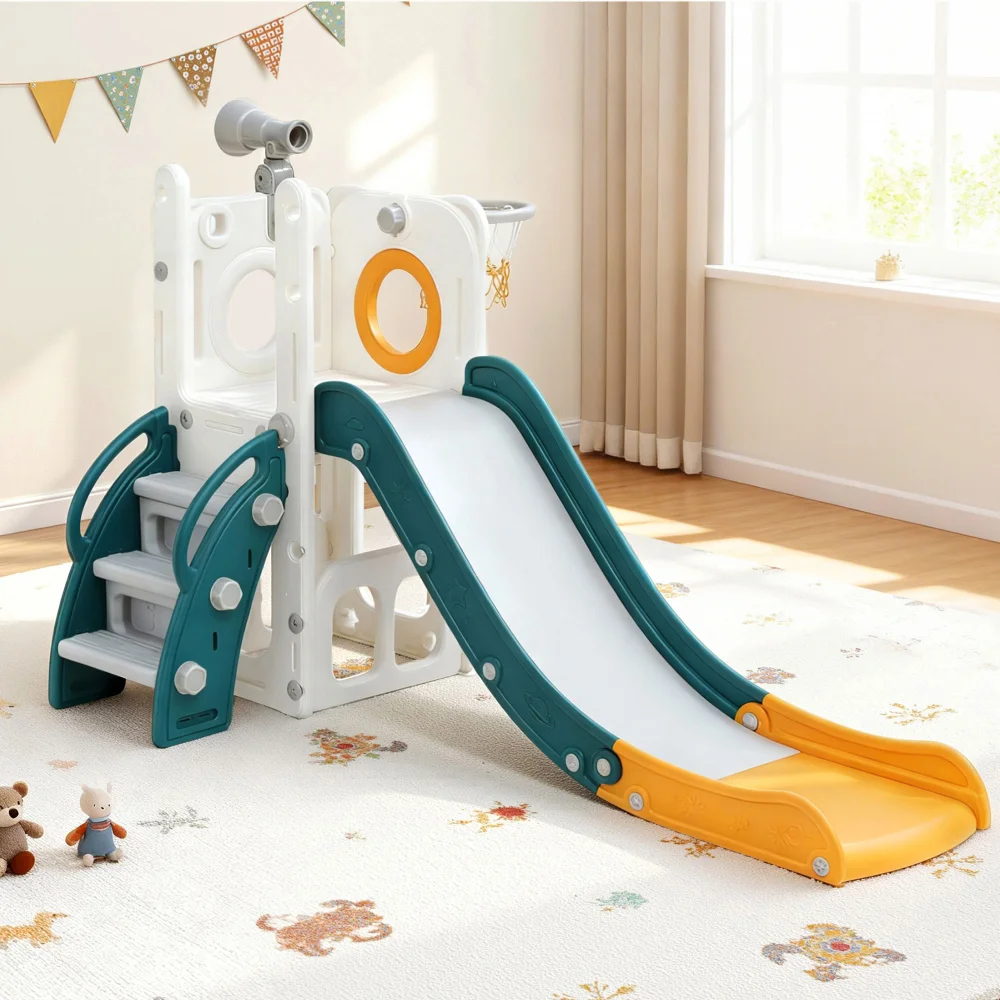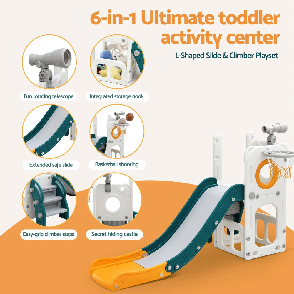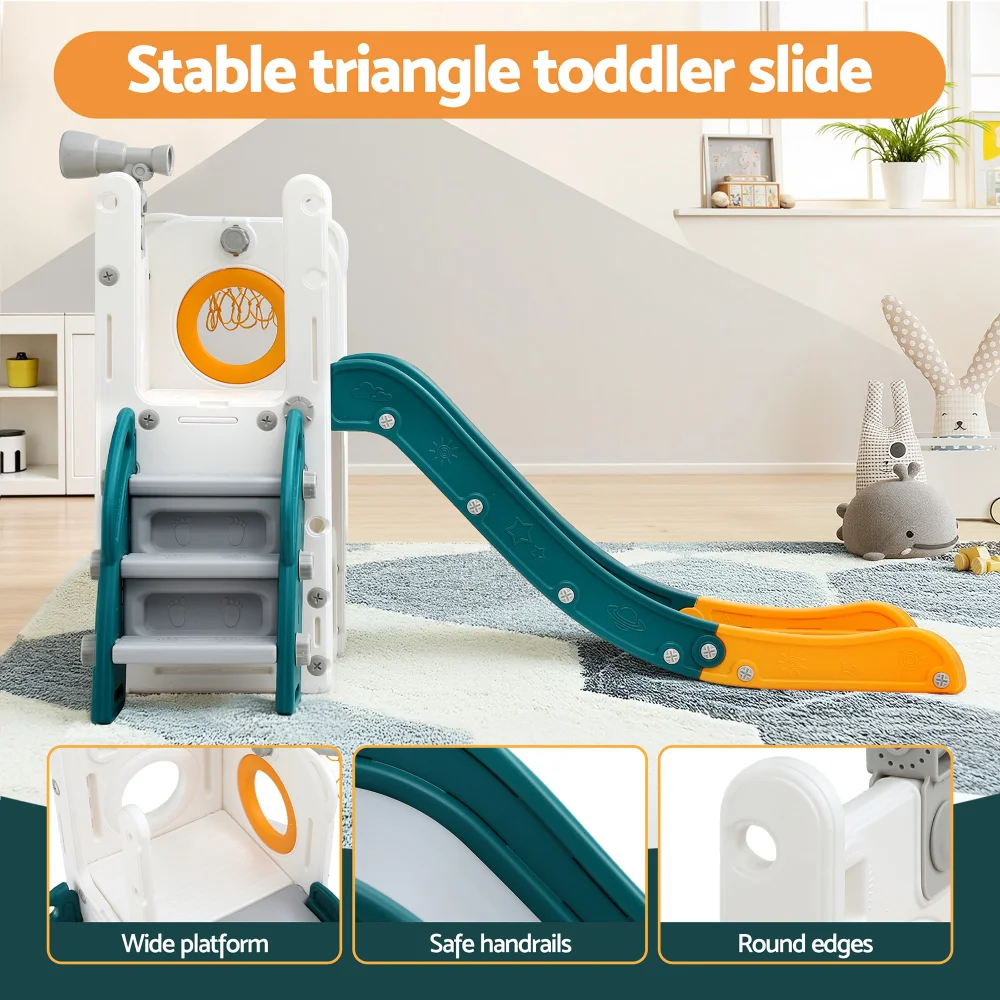 Unleash endless fun with the Keezi Kids Slide Set Basketball Hoop! This multi-activity play structure is expertly designed for active play and safety. Featuring a telescope for imaginative exploration, a climber, a 130cm long slide with safety zones, an engaging basketball hoop, a secret hiding spot, and built-in storage, this set ensures hours of fun. Its sturdy triangle-shaped structure, non-slip steps, and easy-grip handrails offer stability and security. Ideal for developing physical, motor, and social skills, it's foldable for easy storage and simple to assemble.