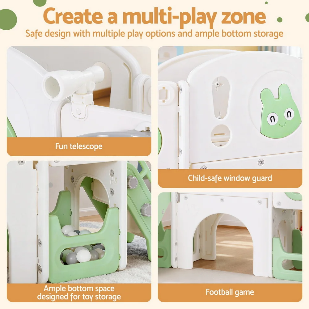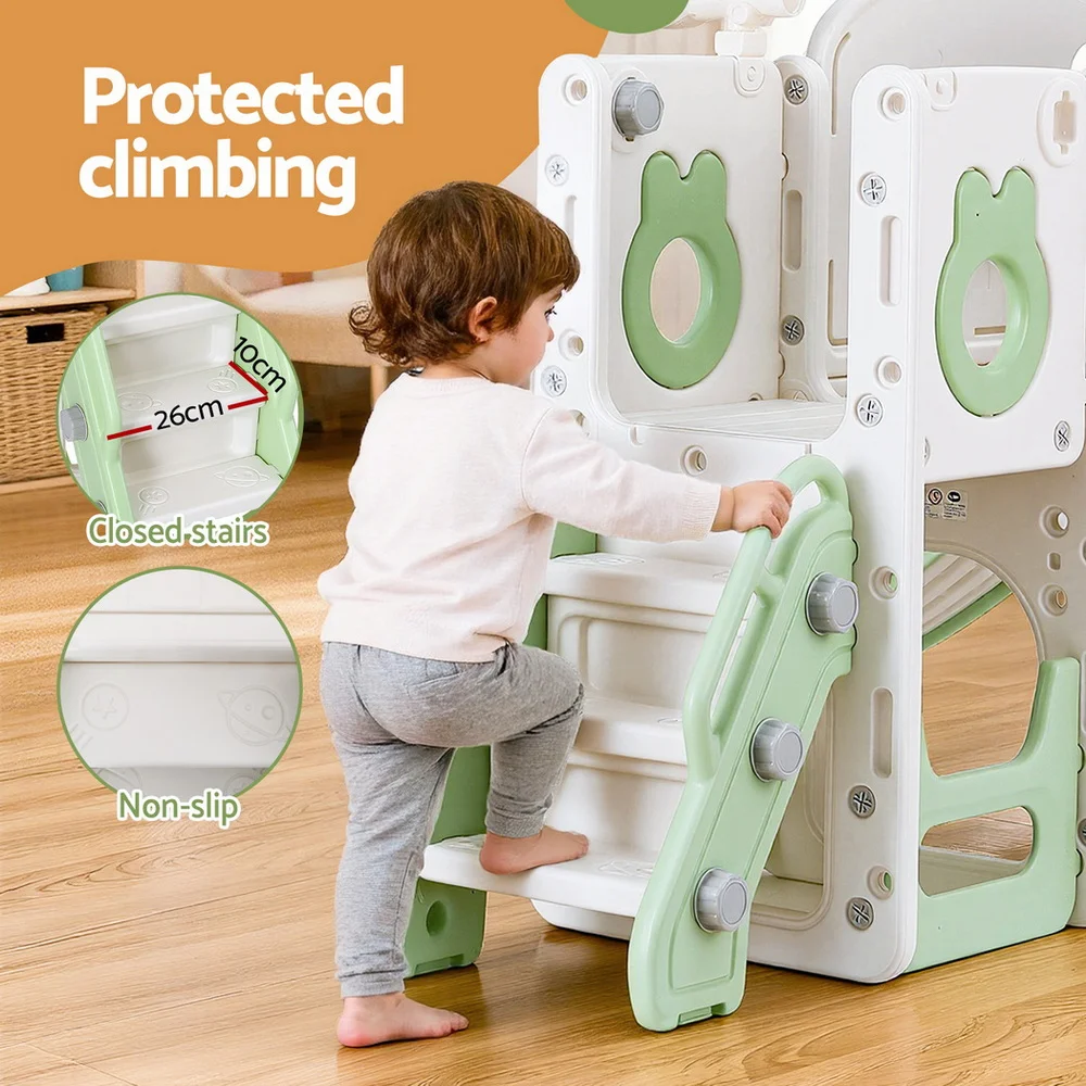 Unleash endless fun and adventure with the Keezi Kids Slide Swing Set Basketball Hoop Ring Football Outdoor Toys. This versatile 4-in-1 play set keeps your children active and entertained with a child-safe swing, wide platform, engaging telescope, and safety ladder. Crafted from premium HDPE in a stylish green and white design, it boasts anti-slip steps, safe grip handles, and ample bottom space for toy storage. Included is a ball and pump for added excitement. Easy to assemble, it’s perfect for both indoor and outdoor play. Note: Adult supervision is recommended while using the swing.