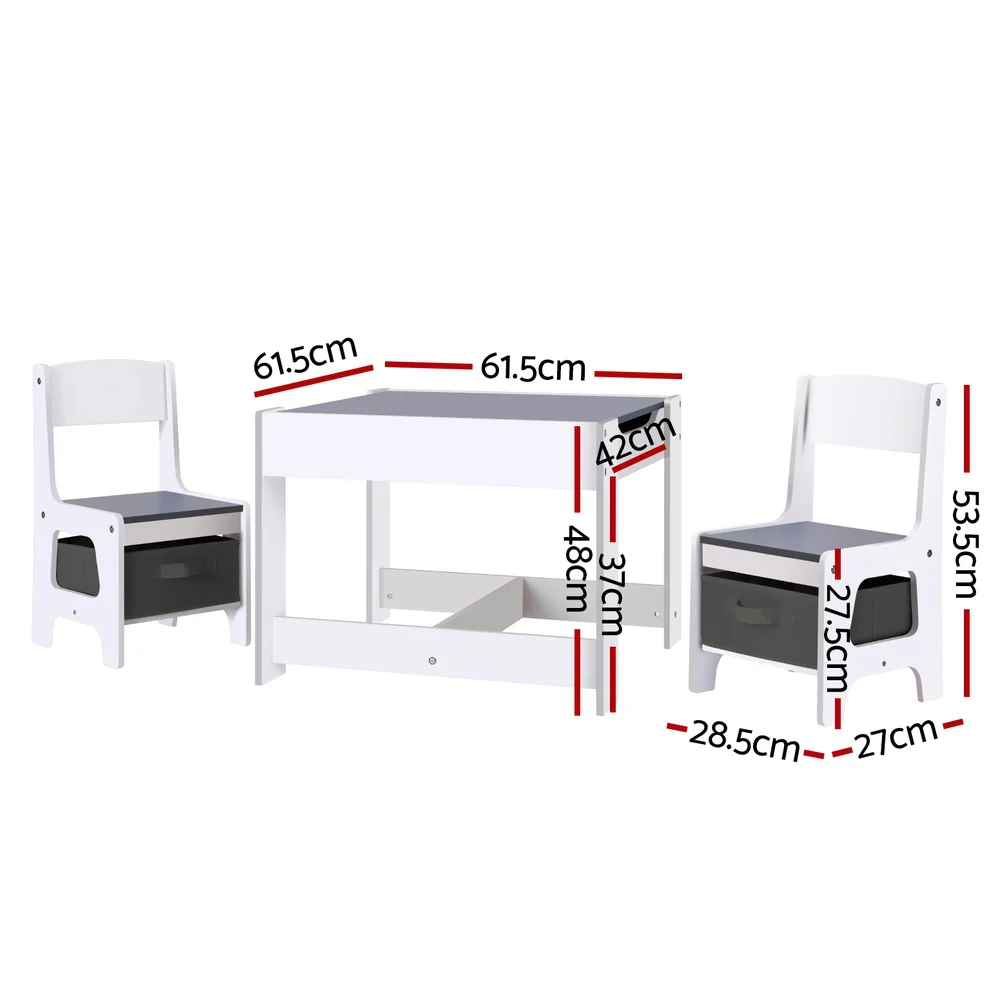 Introducing the Keezi Kids Table and Chairs Set in Grey, a perfect blend of durability and practicality for your child's play and learning space. Crafted from non-toxic materials, this set features a reversible tabletop with a chalkboard desk and hidden storage compartments for toys or art supplies. With sleek, safe edges and ventilation handles on chairs, it ensures comfort and safety. Easy to assemble and clean, this set is ideal for children aged 3 and up and supports up to 50kg. Comes with a 1-year warranty.