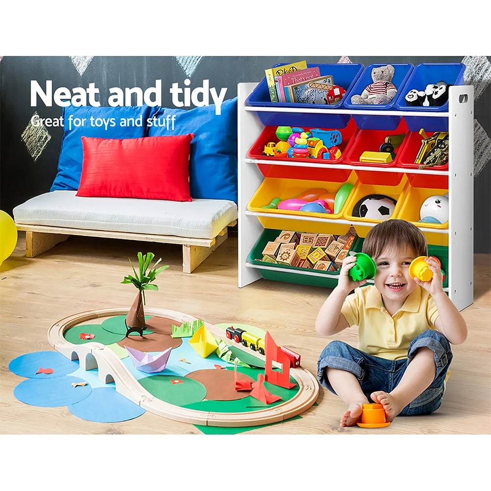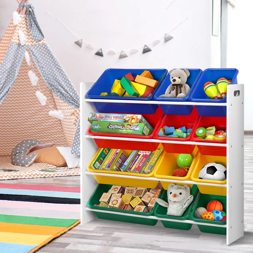 Keezi Kids Toy Box Organiser: 4-Tier Bookshelf with 12 Colourful Bins, Particle Board, 86x27x88cm - Safe Durable Storage