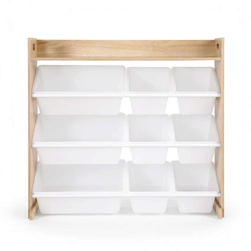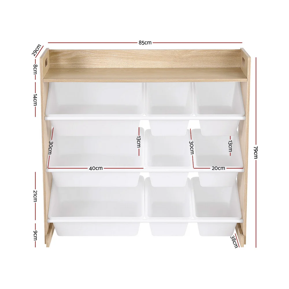 The Keezi Kids Toy Box Organiser is the ultimate solution for cheerful and efficient organisation in your child's space. With its practical 9-bin storage system, this unit features both large and small removable bins across 3 tiers and an open shelf to make tidy-up time enjoyable and accessible for little hands. Designed with child safety in mind, it boasts smooth rounded edges, comfortable handles, and anti-tip protection. The sleek white and wooden finish blends seamlessly with most room decors. Ideal for storing toys, books, and art supplies, it encourages good habits while keeping belongings neat and accessible.