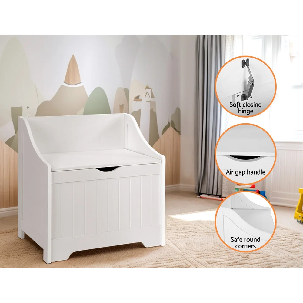 Keezi Kids Toy Box & Bench - MDF, Soft Close Hinges, Safe Corners, 53x34x32.5cm Storage Organiser for Playroom, White