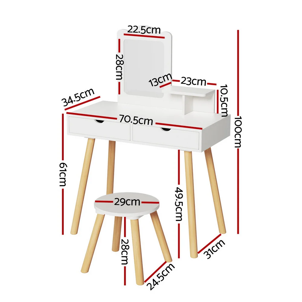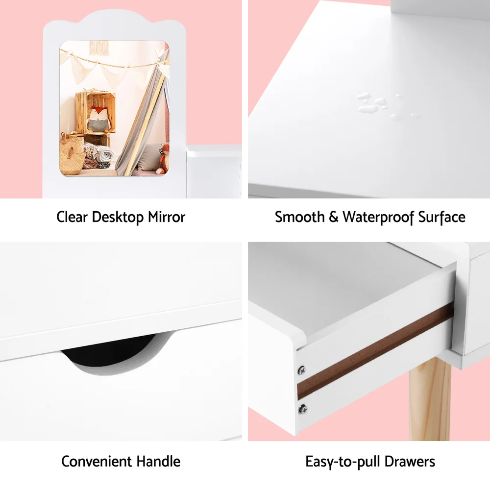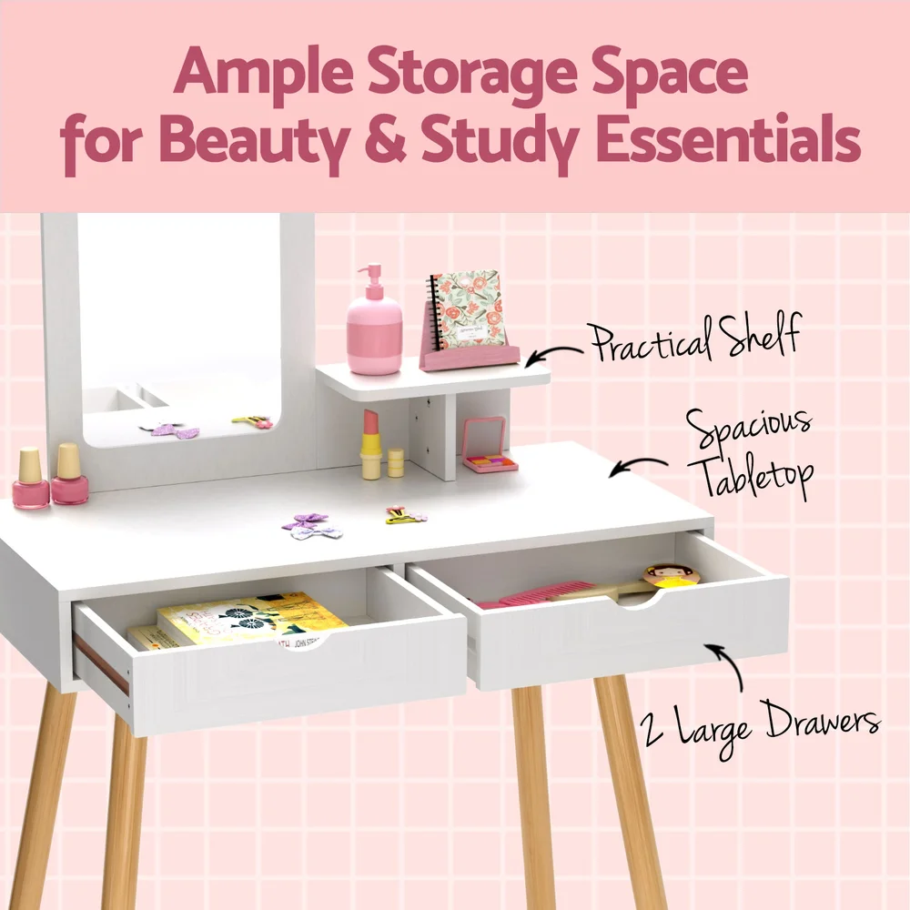 Keezi Kids Vanity Set: White MDF & Rubberwood Dressing Table with Mirror, Drawer, and Chair - Safe, Durable Design