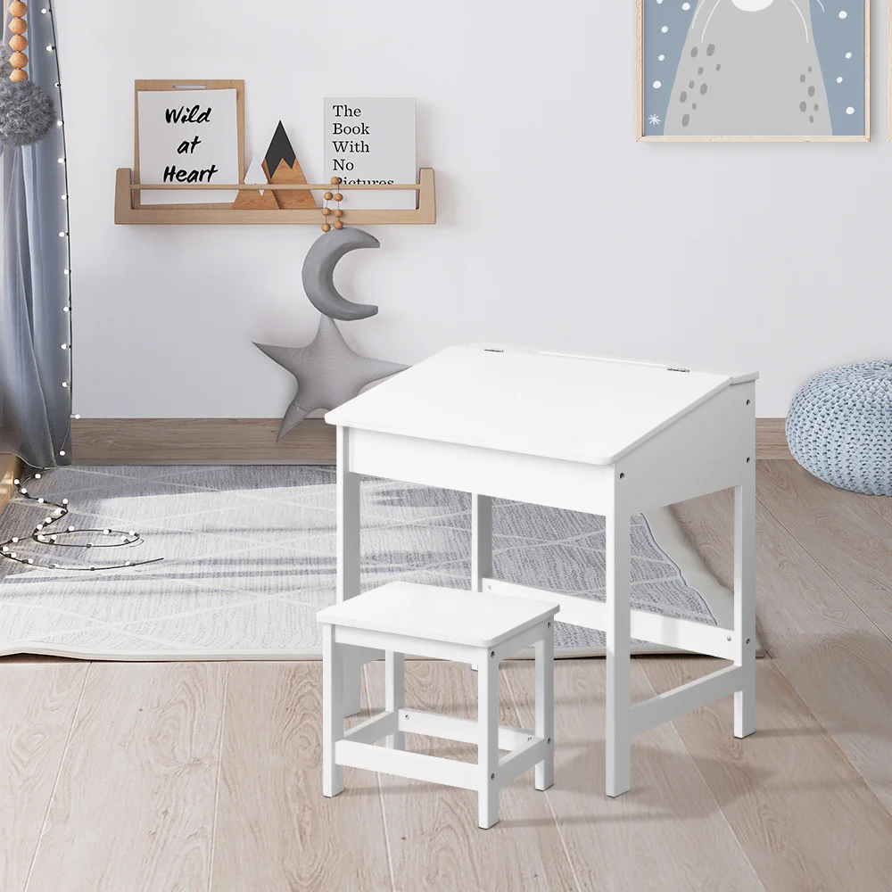 Keezi 2PCS Kids Desk and Stool Set - White, Lift-Top Storage, Inclined MDF Desk, Child-Safe, Non-Toxic Paint, 60x40x