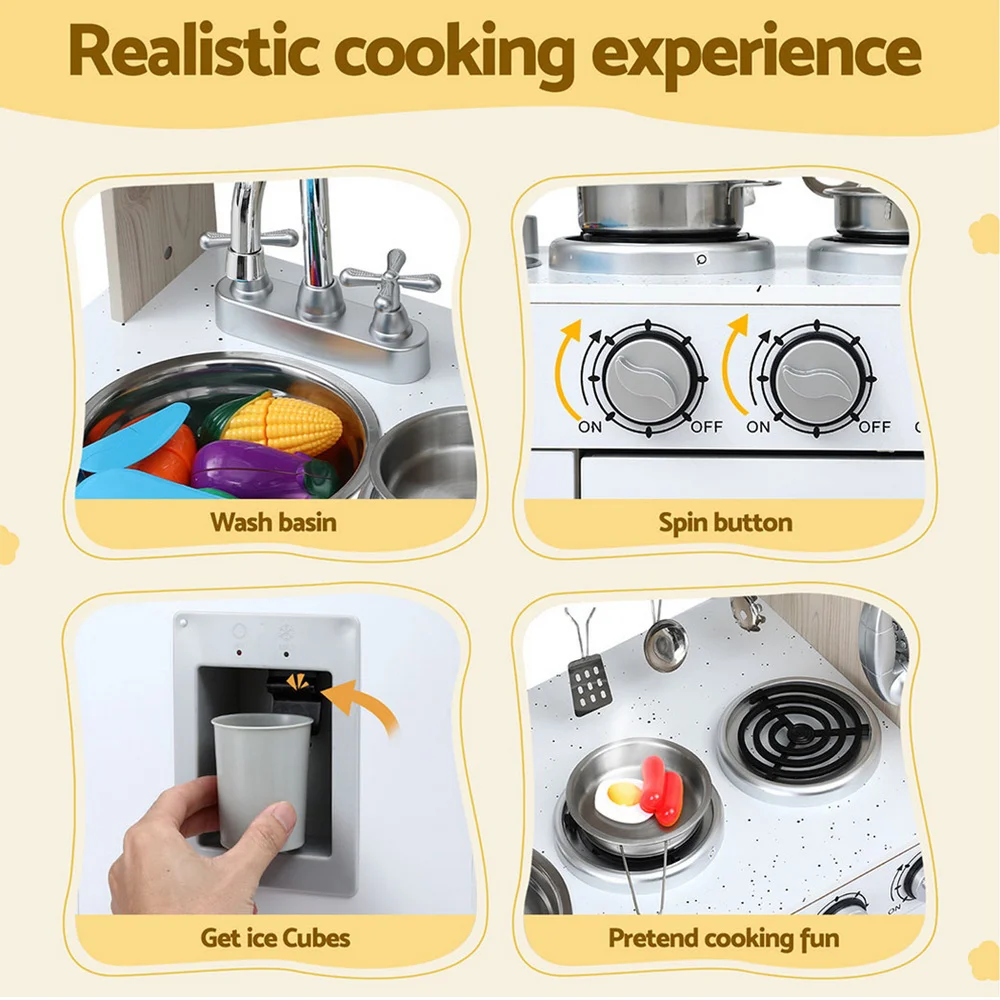 Keezi Kids Wooden Kitchen Play Set - Realistic Pretend Toys with Clock, Phone, Ice Maker, Storage - 72.5x29.5x81.5cm