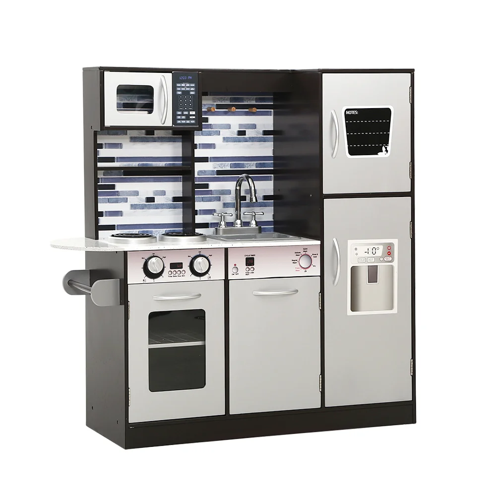 Keezi Kids Wooden Kitchen Play Set - Realistic Modern Design, Sturdy, Safe, 93.5x30x93cm, Black & White, Ages 3+