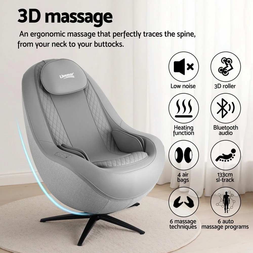 Livemor 3D Roli Electric Massage Chair Recliner, Zero Gravity, 133cm SL-Track, Heated Waist, Bluetooth, Grey PU Leather
