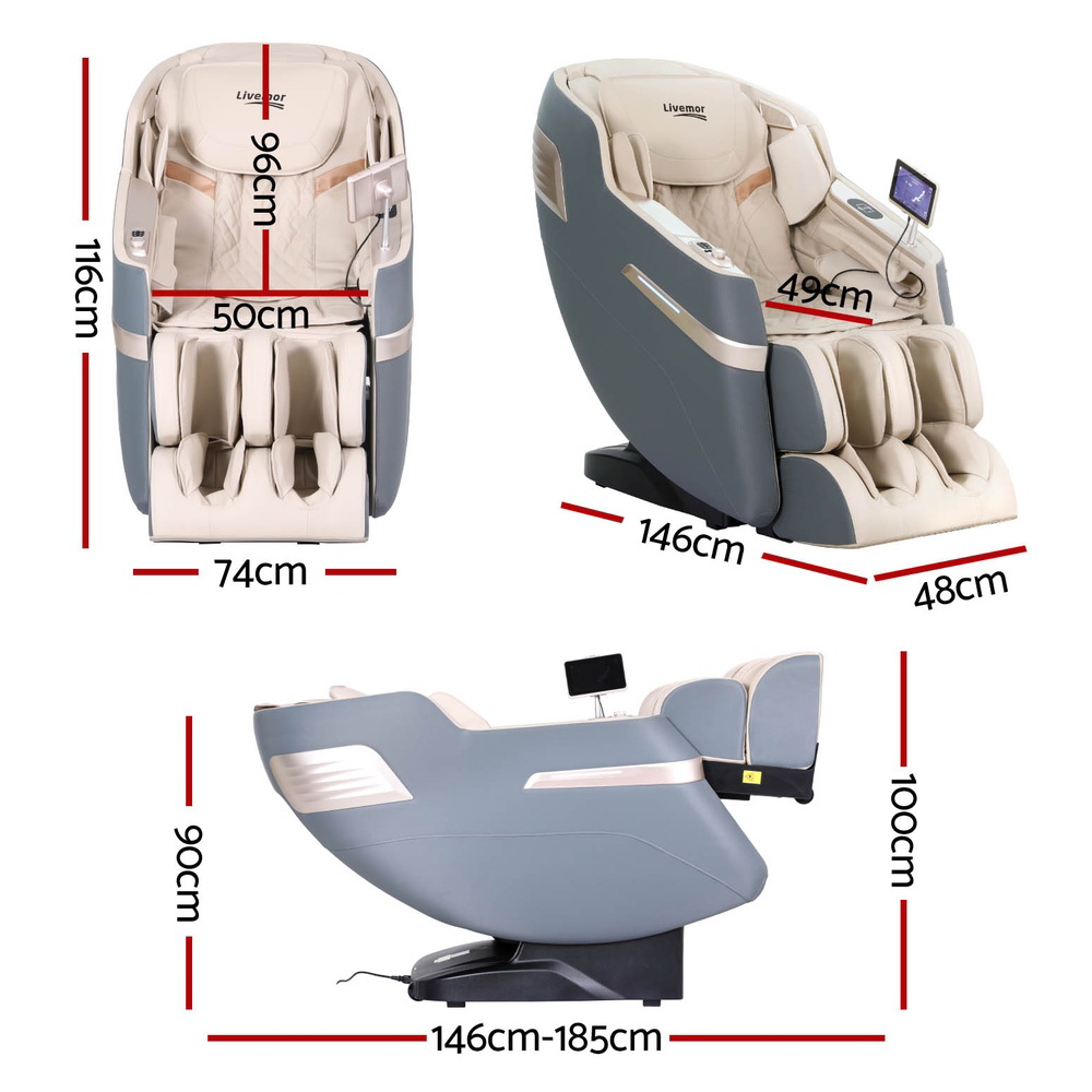 Experience unparalleled relaxation with the Livemor 4D Massage Chair. Featuring 4D back rollers and a 130cm SL-track, it delivers a comprehensive massage from neck to thighs. Enjoy 12 auto programmes, adjustable roller intensity, and heated therapy. With AI voice control, a 7-inch LCD touch screen, and 3D Bluetooth speakers, customise your comfort effortlessly. This sleek grey recliner supports up to 150kg and includes a 3-year warranty, ensuring peace of mind with every use.