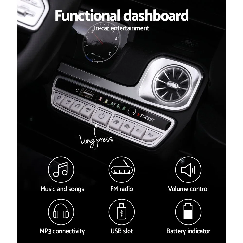 Ignite your child's sense of adventure with the Rigo Kids Electric Ride On Car, a licensed Mercedes-Benz AMG G63. This sleek black ride-on offers a realistic driving experience with its steering wheel and acceleration pedal, complemented by twin motors for smooth forward and reverse operations. Equipped with a safety seat belt and a remote control for parental oversight, this car promises a secure and thrilling ride. Designed for young car enthusiasts aged 3 and up, it features built-in music, headlights, and a lacquer finish that mirrors the elegance of a real Mercedes-Benz. With a loading capacity of 30kg and speeds of 3-5km/h, it's perfect for little drivers seeking big adventures.