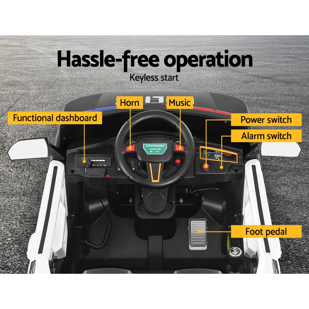 Let your child's dreams of being a hero take flight with the Rigo Kids Electric Ride On Patrol Police Car. This sleek ride offers a realistic driving experience with a responsive steering wheel and acceleration pedal. Equipped with a safety seat belt and remote control for parental oversight, this police car ensures both safety and fun. Its built-in music, horn, and flashing lights spark imagination, while the twin motors and keyless start add excitement. With a lacquer finish and anti-slip tyres, it's built for adventure. Perfect for children aged 3 and above, the Rigo Police Car is a thrilling way to explore the world.