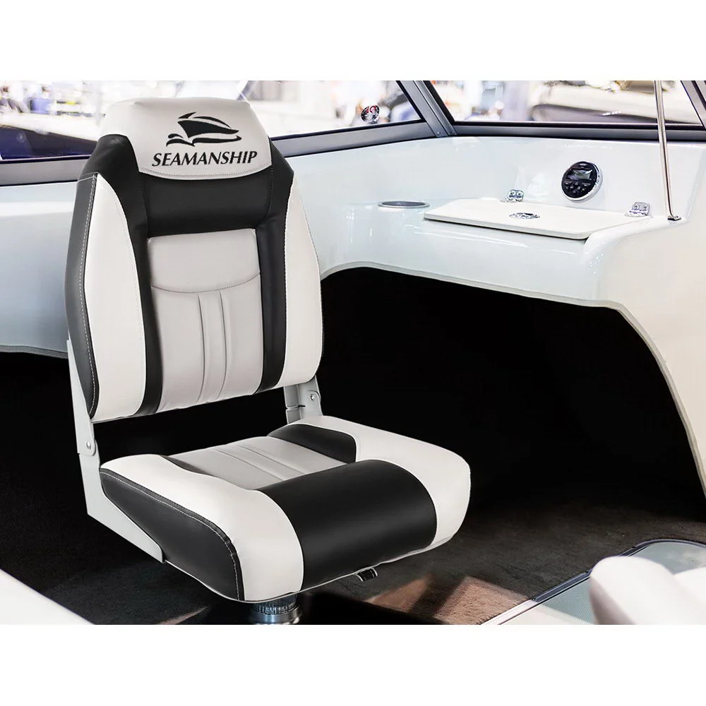 Upgrade your boating experience with Seamanship's 2X Folding Boat Seats. Designed for ultimate comfort and durability, these seats feature high-compression foam padding and a robust construction with rust-resistant alloy hinges and stainless steel hardware. The swivel design adds convenience, while the foldable feature ensures easy storage. Weatherproof and resistant to salt water and UV rays, these seats are perfect for any marine adventure, fitting any standard pedestal effortlessly.