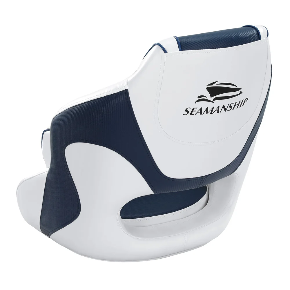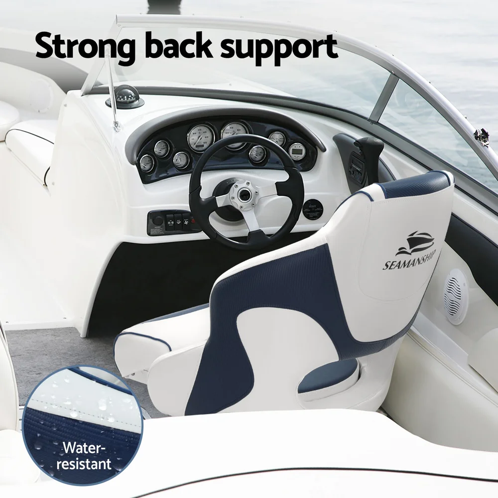 Embark on your maritime journey with the Seamanship Captain Bucket Boat Seat. This blue and white flip-up seat, crafted from saltwater and UV-resistant PVC, promises comfort with its 15cm high-compression foam padding. Designed to contour your body, it features a robust stainless-steel swivel base and fasteners for secure, adjustable seating. The flip-up bolster offers added height, making it ideal for all sailing needs. Enhance your boat with this durable, supportive seat, backed by a 1-year warranty.