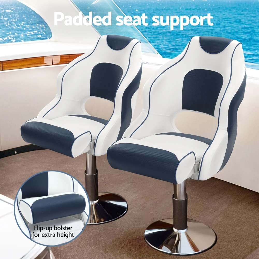 Seamanship Folding Boat Seats, Premium Plastic & UV-Resistant PVC, 13cm Padding, White/Blue, Set of 2 with Swivel Base