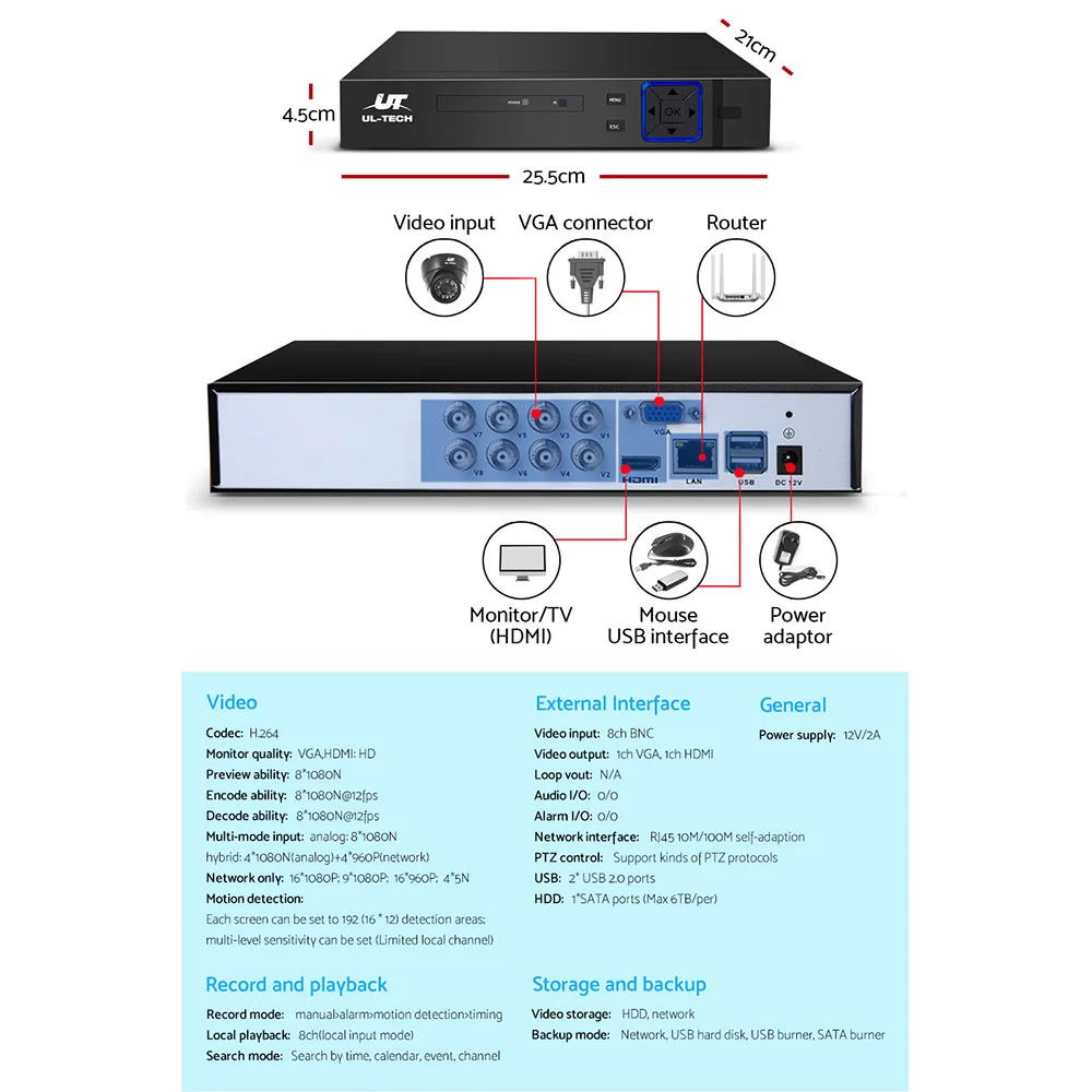 UL-TECH 8CH DVR 1080P 5-in-1 CCTV Recorder with 4TB HDD, Remote Access, Motion Detection, HDMI, VGA, USB, Cloud Support