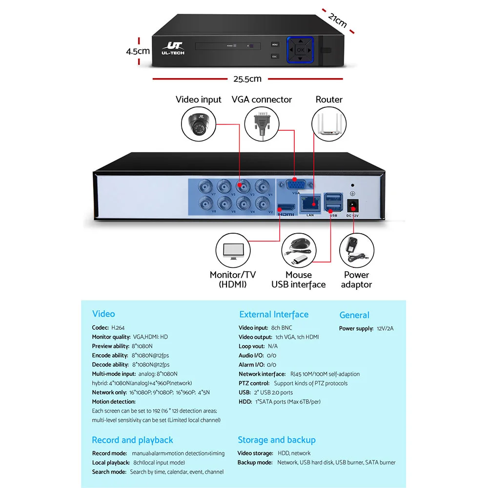 UL-TECH 8CH 1080P DVR CCTV Video Recorder - 5-in-1, Remote Access, Motion Detection, HDMI/VGA, Cloud Compatible