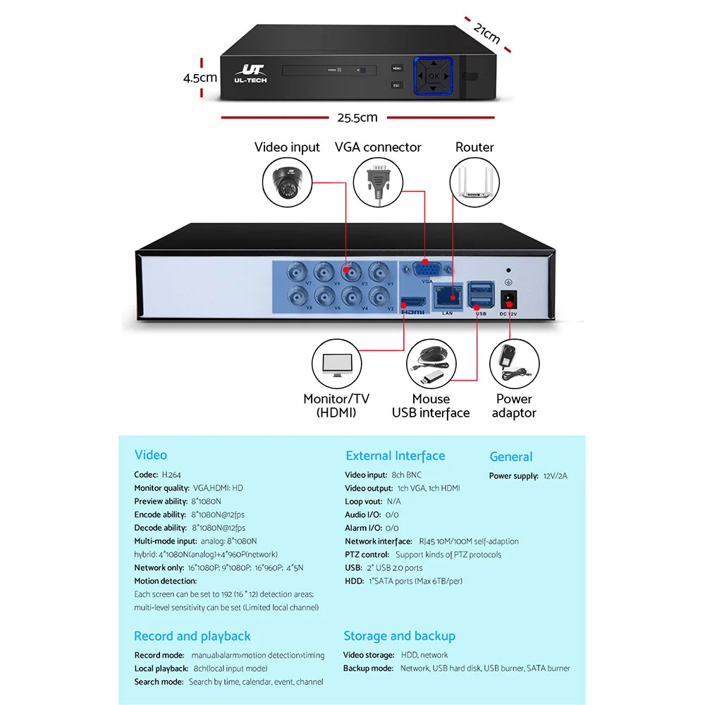 UL-TECH 8CH DVR 1080P 5-in-1 CCTV Recorder with 4TB HDD, Remote Access, Motion Detection, HDMI, VGA, USB, Cloud Support