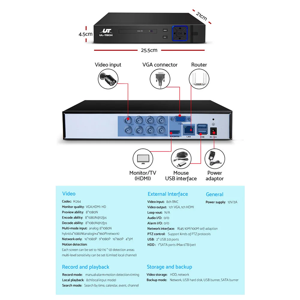 UL TECH 8CH DVR CCTV Security System with 8 Cameras, 1080P HD, Motion Detection, Infrared Night Vision, Remote Access