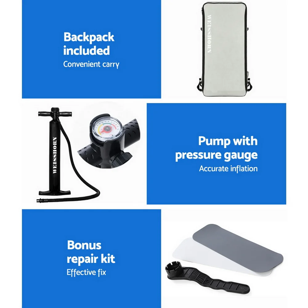 Embark on your water adventures with the Weisshorn Stand Up Paddle Board. Designed for both beginners and seasoned paddlers, this 11ft inflatable SUP offers exceptional durability with its 15cm drop-stitch core material and a weight capacity of up to 160kg. Effortlessly inflate or deflate with the included pump, and enjoy smooth navigation with its adjustable aluminium paddle and triple-fin system. Transform it into a kayak with the included seat for enhanced comfort. Portable and convenient, it comes with a backpack and repair kit for on-the-go adventures. Enjoy peace of mind with a 2-year warranty.
