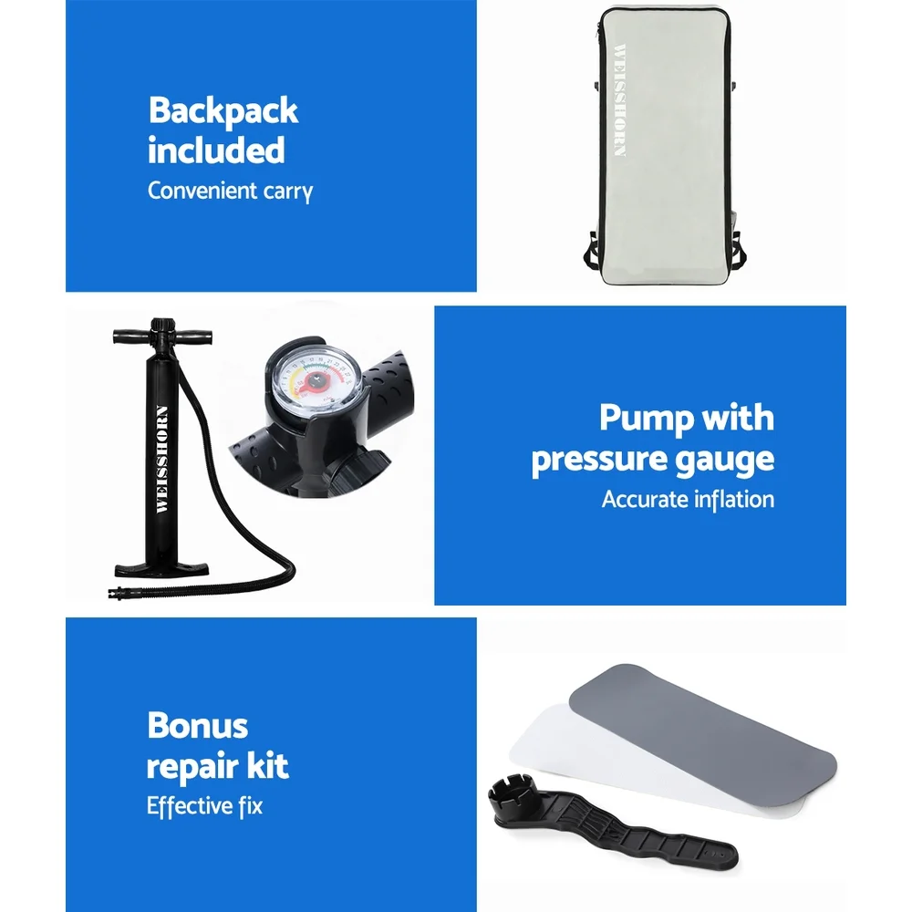 Discover the ultimate in aquatic adventure with the Weisshorn Stand Up Paddle Board 11ft Inflatable SUP. Perfect for both beginners and seasoned paddlers, this board combines durability and performance with its 15cm thick drop-stitch core and 185kg weight capacity. Enjoy easy manoeuvrability with three fins, one removable for enhanced stability. Effortlessly inflate and deflate, and convert to a kayak with the included seat. With a travel bag, pump, and repair kit, it's ready for any water escapade. Two-year warranty included.