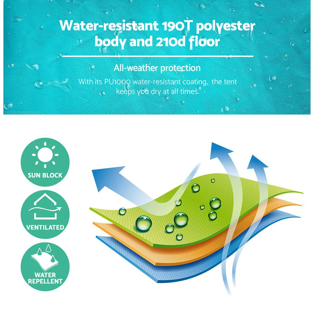 Experience the great outdoors with the Weisshorn Pop-Up Beach Tent, designed for effortless setup and comfort. This versatile 3-person tent is perfect for any adventure, featuring heavy-duty 190T PU material for water and UV resistance, and a silver-coated interior to enhance light and minimise heat. Simply toss it to see it pop up, anchor it with the included pegs, and pack it away in the convenient carry bag. Whether on the beach or in the backyard, enjoy memorable moments with Weisshorn.